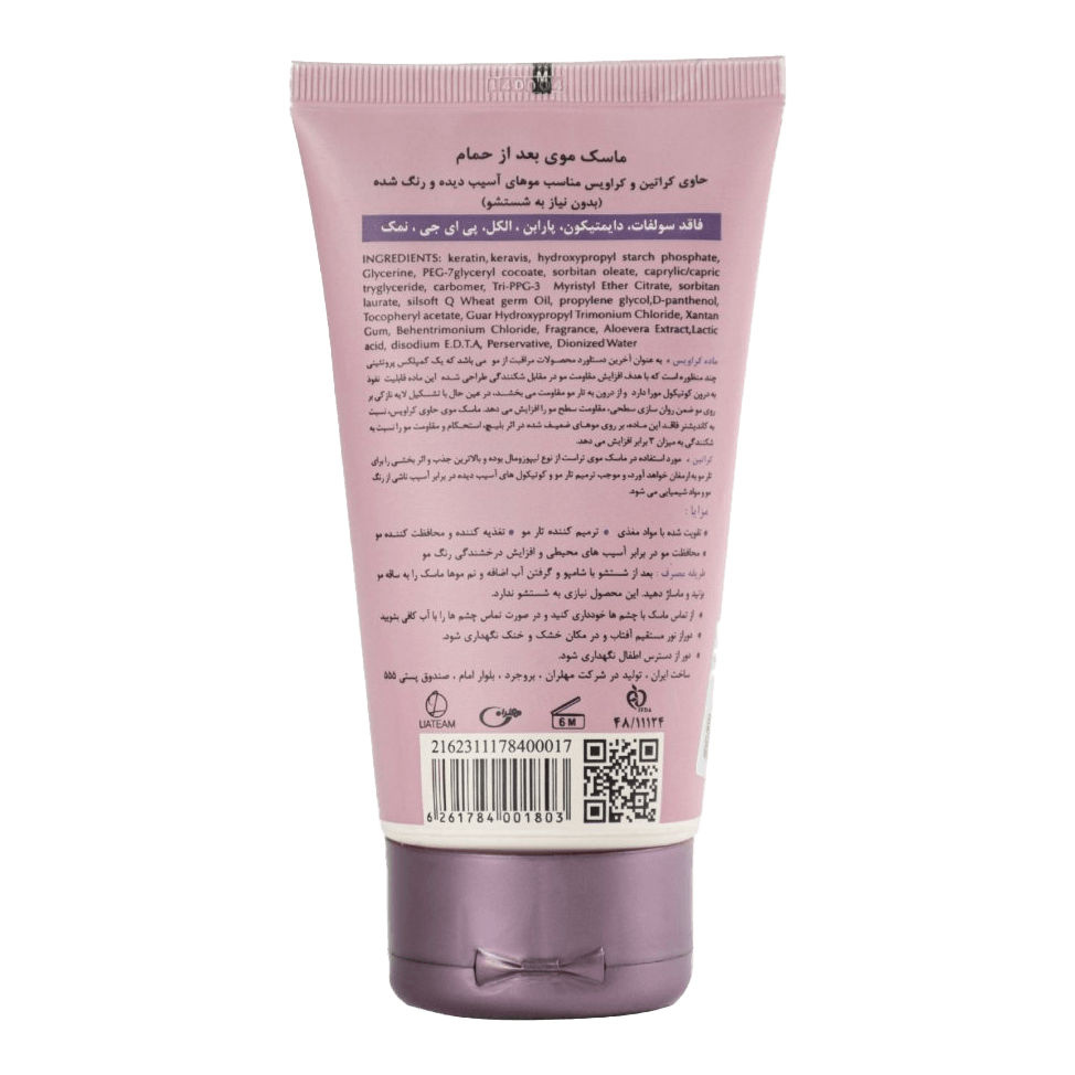ترميم موهاي رنگ و دكلره شده، آسيبديده، خشك و وزشده. نرم كننده، مغذي و آبرسان تار مو. تقويت تار مو و افزايش ضخامت مو. ضدموخوره، ضد گره و كرك شدن. ايجاد لايه محافظ بر روي مو و درخشانكننده مو. فاقد سولفات و ايدهآل براي موهاي كراتينه، بوتاكس يا پروتئينه شده.